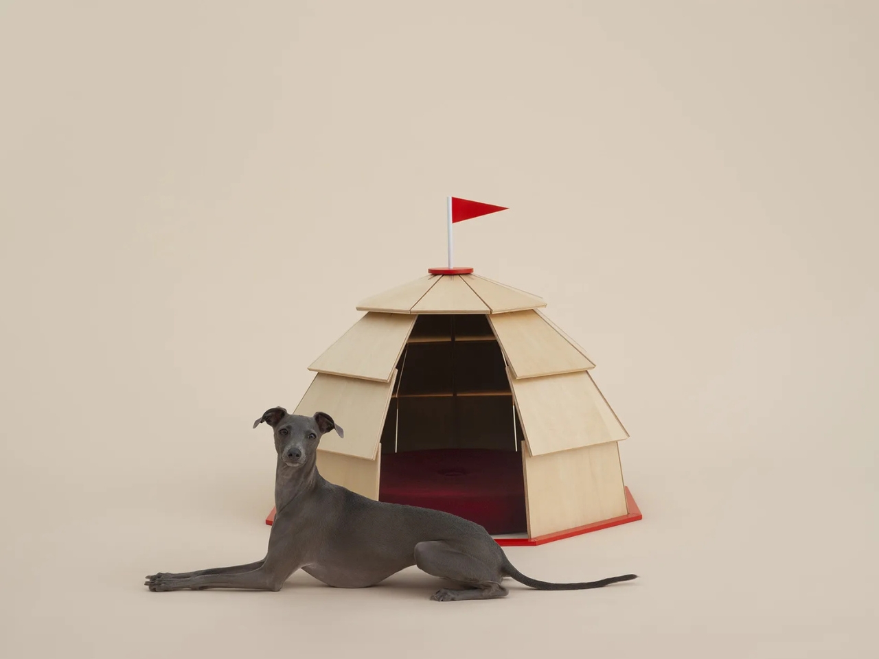 Since it’s the exhibit’s Italian debut, two contributions from local designers were also added. Giulio Iaccheti created a round, plywood-panelled kennel specifically for an Italian greyhound, looking like a tent complete with a red velvet cushion and with a small scarlet flag on top of its house. Piero Lissoni meanwhile crafted a plywood and aluminum kennel for a Yorkiepoo, inspired by of all things, an airport hangar.